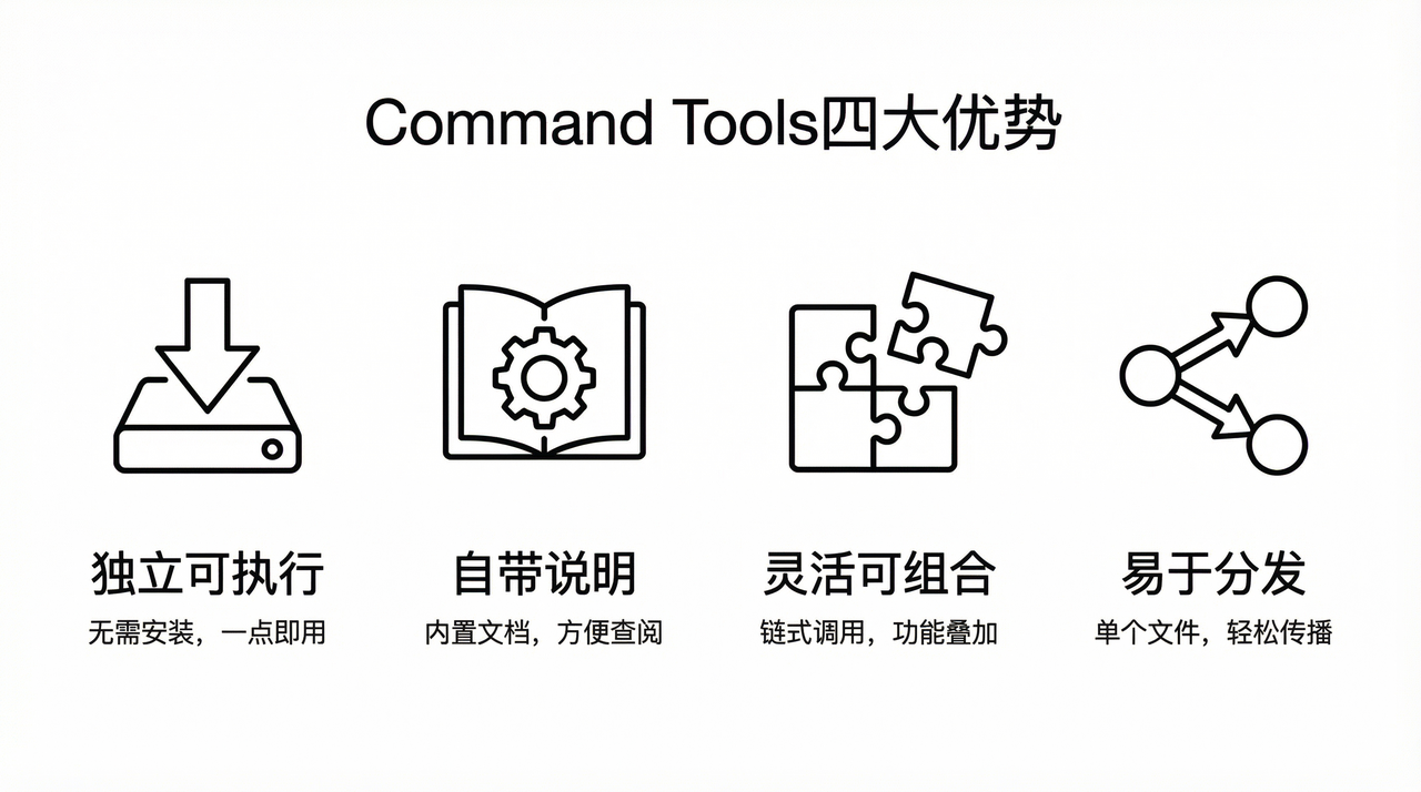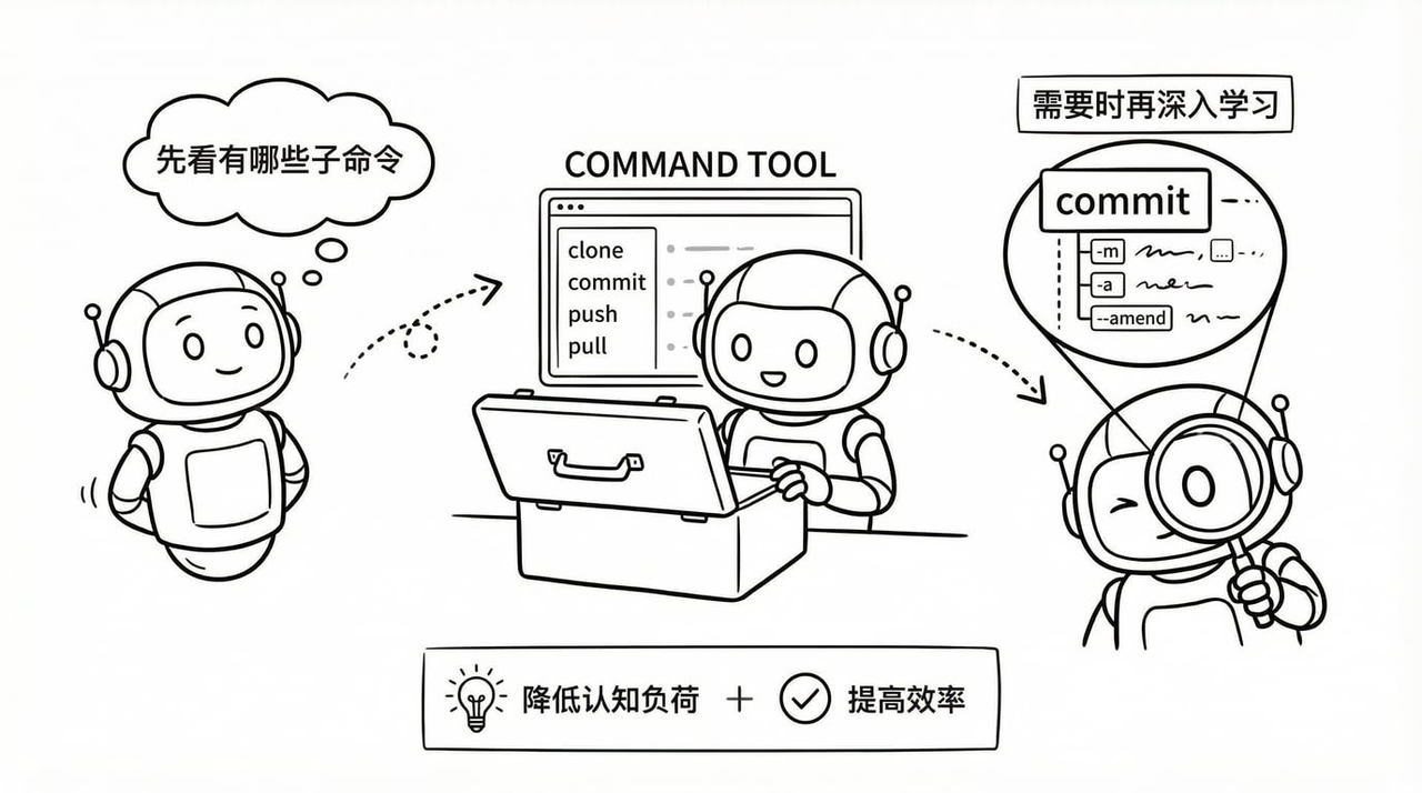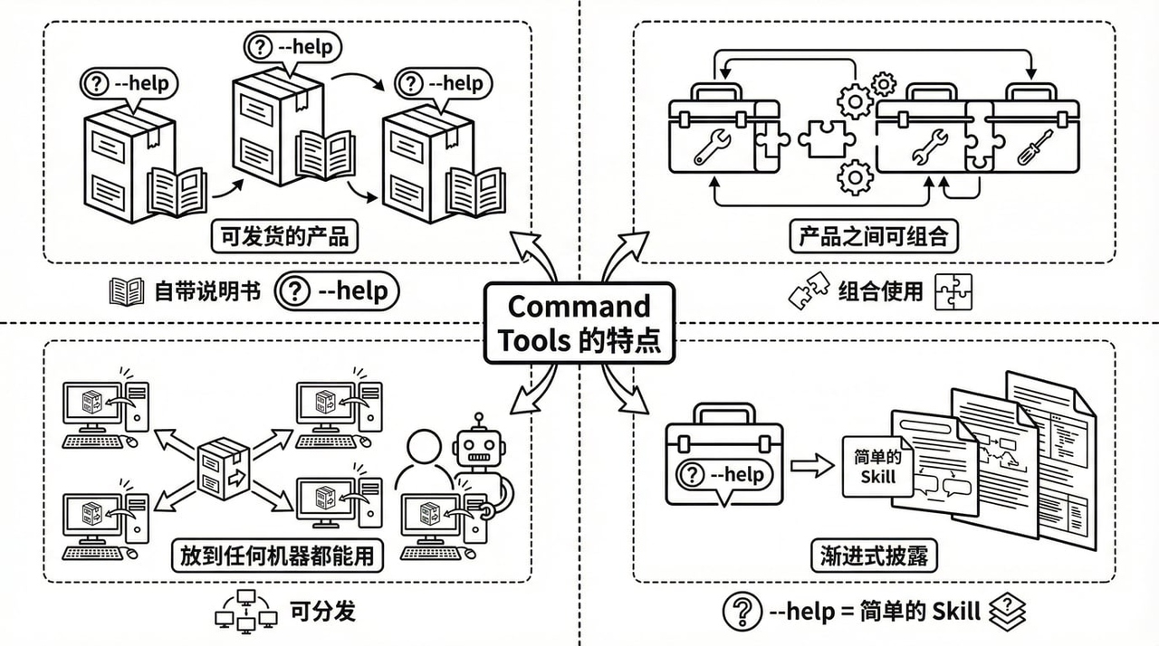 这就是 Command Tools 的思路:它把工具做成"可以直接发货的产品",每个产品都自带说明书,产品之间还能组合使用。并且,他是可以分发的,放到任何一台机器上,都可以被人或者AI直接使用。此外,世界上早已经存在大量的工具了,成千上万的Command Tool. 每个Tool 都有 --help 按钮,相当于一个简单的Skill, 而且是渐进式披露,你需要用一个子命令,只要用这个子命令的 --help ,就会可以指导这个子命令的操作。