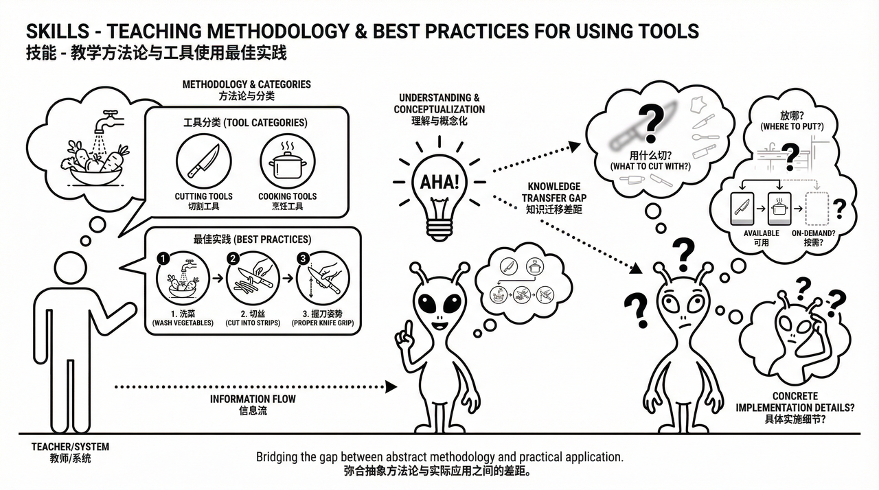 你说:"工具嘛,大概分几类。有'切东西'的能力,有'煮东西'的能力,有'连接网络'的能力……而且我还会告诉你切东西的最佳实践:先洗菜、再切丝、刀要这样握才安全……"