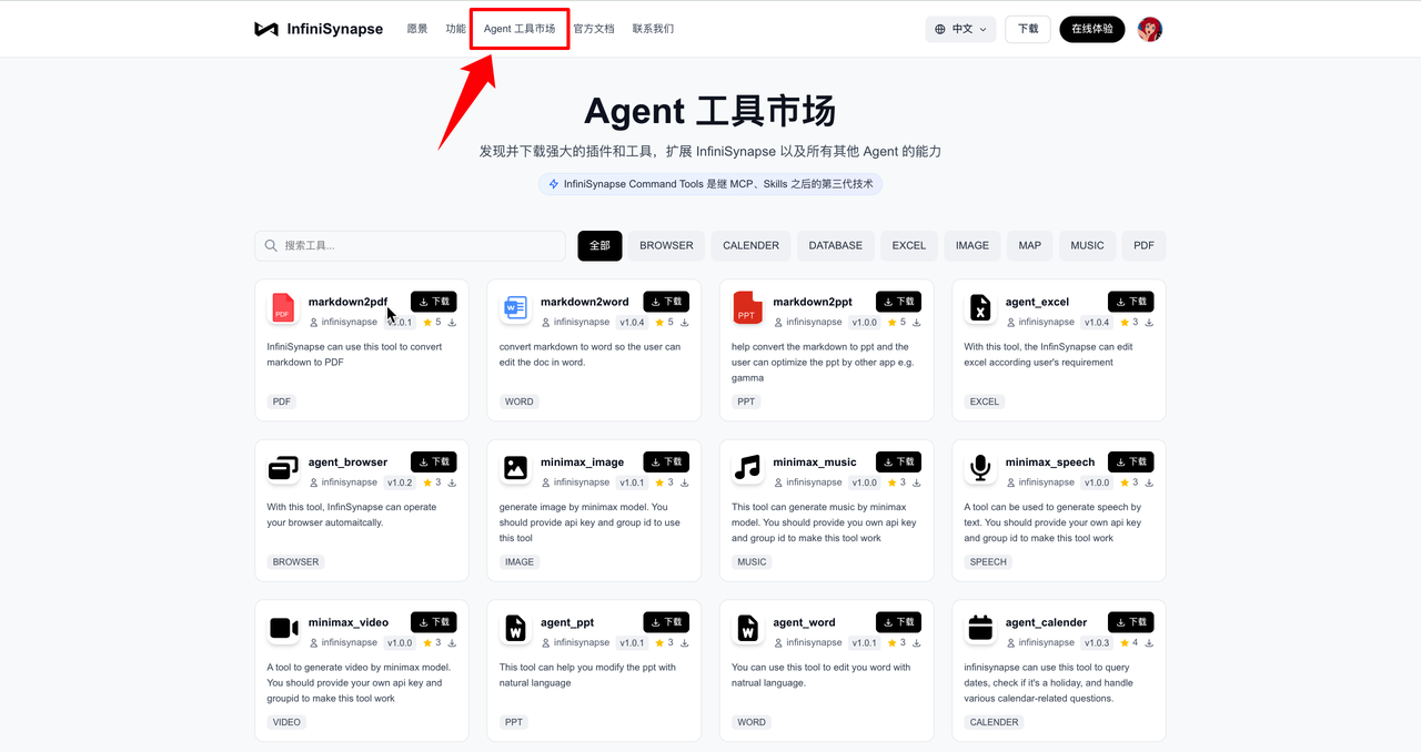 我们相信,好的工具就应该实实在在地解决问题。所以,我们首批开放了包含 Office套件桶、多模态工具、预测天气、地图功能 等17个常用工具,只要注册,就能 永久免费 使用。更重要的是,我们秉持开放的理念,这些工具下载后不仅能在 InfiniSynapse 上使用,也同样兼容 MoltBot(ClawdBot)和其他主流的 Agent 平台,真正做到“一次获取,处处可用”。