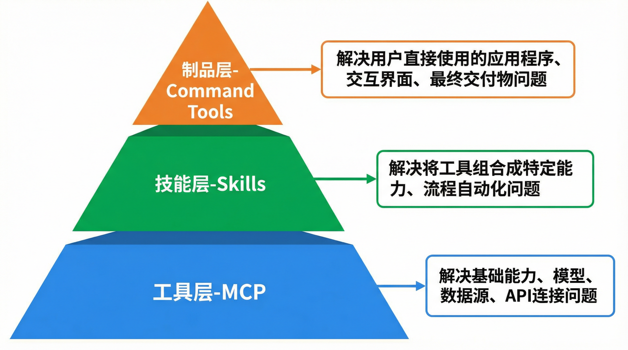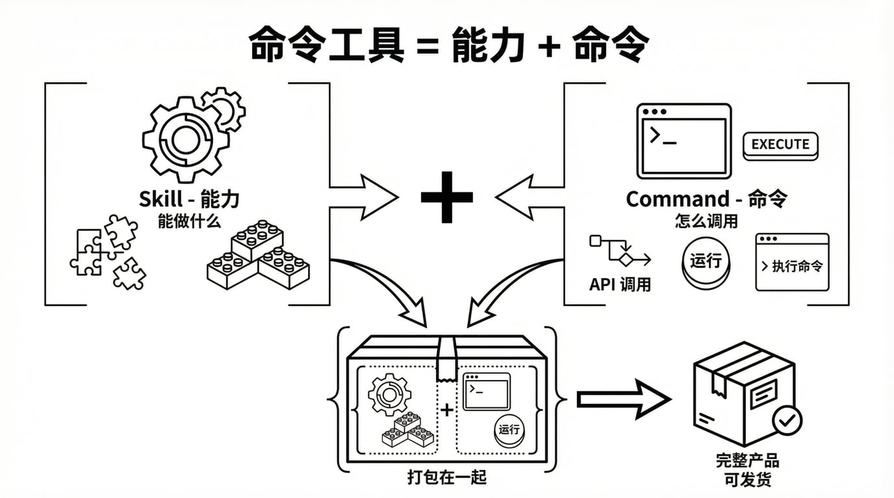 在"怎么给 AI 做工具"这件事上,业界有很多讨论。你可能听说过一些词:MCP、Skills、Command Tools。这些词代表了工具的三个进化方向。我先用一个比喻帮你理解,然后再逐个详细解释。