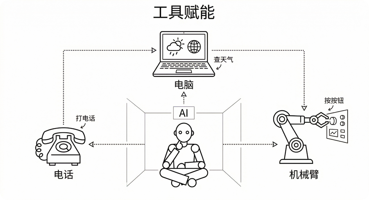 AI 通过"调用"工具来完成它自己做不了的事