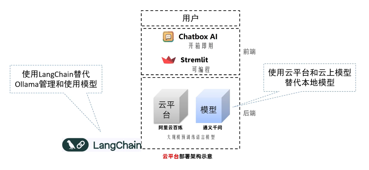 云上大模型架构使用LangChain框架代替Ollama,完成对模型的管理和使用,用基于LangChain提供Python调用支持使用阿里云百炼平台的通义千问系列模型,提供云上的模型算力支持前端不变,继续使用Streamlit原有代码即可LangChain框架介绍LangChain由Harrison Chase创建于2022年10月,它是围绕LLMs(大语言模型)建立的一个框架.