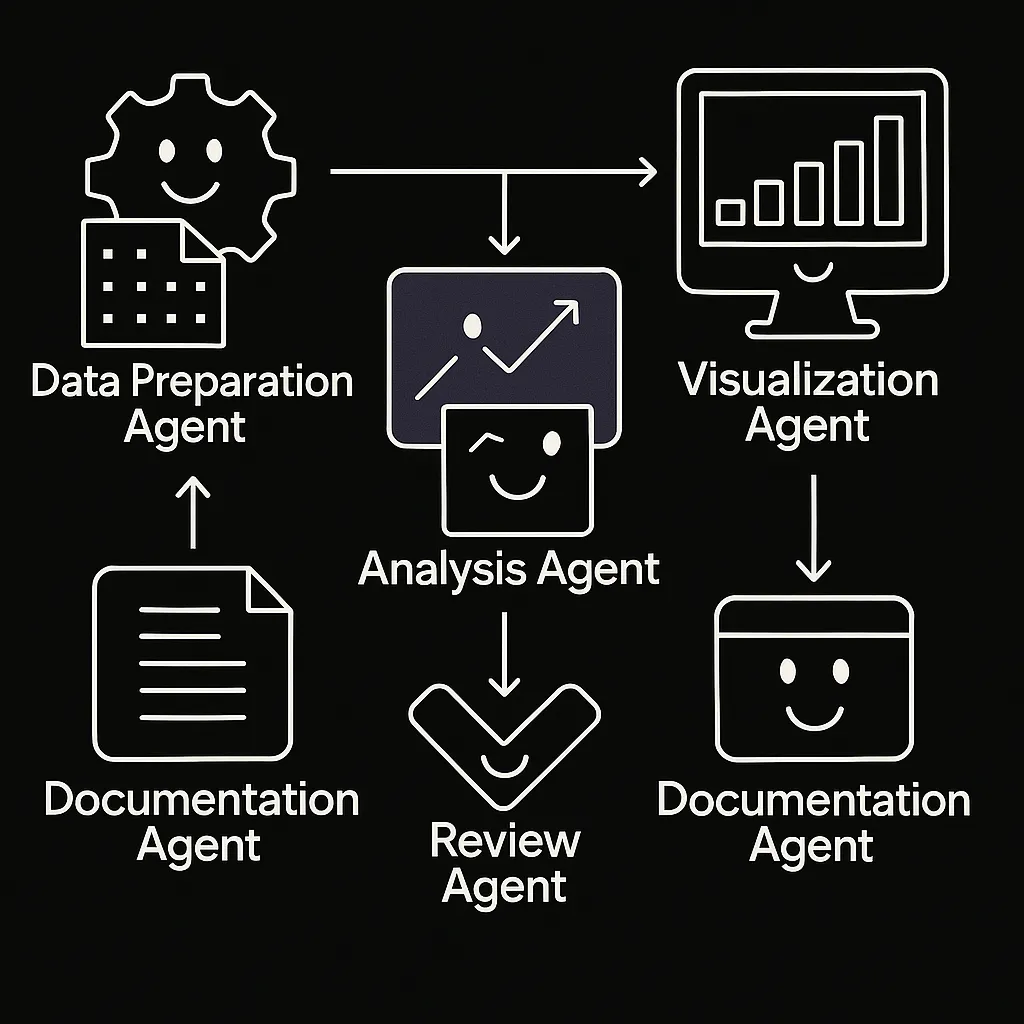 更强大的是,当多个AI智能体协同工作时,这种自主能力会呈指数级放大,相当于拥有一支24小时不间断工作的专业团队。以复杂数据分析项目(程序员常接触的场景)为例,多智能体的协作流程的:
