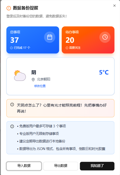 专业版还有优先技术支持,我上次遇到一个小问题,联系了开发者,很快就解决了,特别贴心。还有账号安全功能,我可以随时修改密码,要是忘记密码了,也能通过邮箱找回,特别放心。还有专门的常见问题板块,不管是数据同步、升级专业版、AI 总结使用,还是倒数日与事项的区别,都能在里面找到答案,我第一次用的时候,就是靠常见问题搞懂了倒数日和事项的区别,避免了混淆,特别实用。