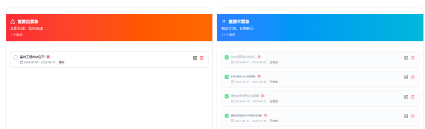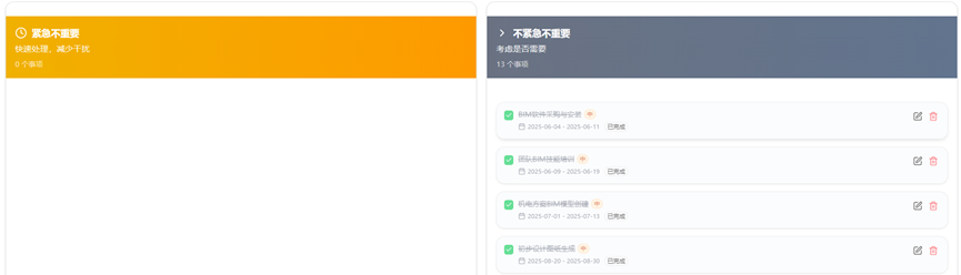 做 BIM 项目最头疼的就是任务分类,37 个任务有高优先级的碰撞检查,也有不紧急的资料整理,以前我总分不清先做哪个,直到用了时光本的四象限分析。它是按艾森豪威尔矩阵来分的:把 “碰撞检查” 这种高优先级 + 7 天内截止的任务归到 “重要且紧急”,把 “模型维护” 这种高优先级 + 7 天后截止的归到 “重要不紧急”,把 “团队聚餐” 这种中优先级 + 7 天内的归到 “紧急不重要”,把 “整理旧项目资料” 归到 “不紧急不重要”。我每天打开四象限页面,先把重要紧急的任务搞定,再也不会手忙脚乱地被各种琐事牵着走。
