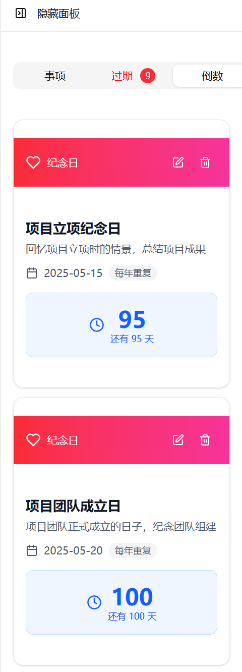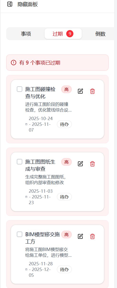 我还在日历里设置了倒数日提醒,项目的主体结构封顶、和老婆的结婚纪念日,还有老妈的农历生日,都设置了每年重复,日历格子里会自动显示紫色标签,不用特意翻列表,扫一眼日历就知道还有多少天。最贴心的是过期事项提醒,只要是待办任务过了截止日期,就会用红色背景标出来,还会单独放在一个专属 Tab 里,右上角标着过期数量,上次我差点漏了 “模型移交” 这个重要任务,打开日历一眼就看到红色的提醒,赶紧安排了时间,再也不会因为漏任务被老板点名了。