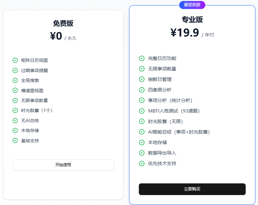 其实最打动我的是,这是一个个人开发的小工具,没有花里胡哨的广告,很用心,专业版 19.9 一年,比我之前用的付费项目管理软件便宜多了,功能还全。不管你是被工作项目缠得焦头烂额的打工人,还是要打理生活琐事的普通人,或是有保密需求的人,如果你也被零散的记录搞得头大,也怕错过生活里的小美好,不妨试试时光本,它不是那种冷冰冰的工具,更像是你的专属时光管家,帮你把工作、生活甚至是保密事项都理得清清楚楚,把那些珍贵的瞬间都好好收藏起来。