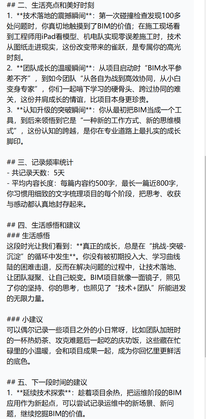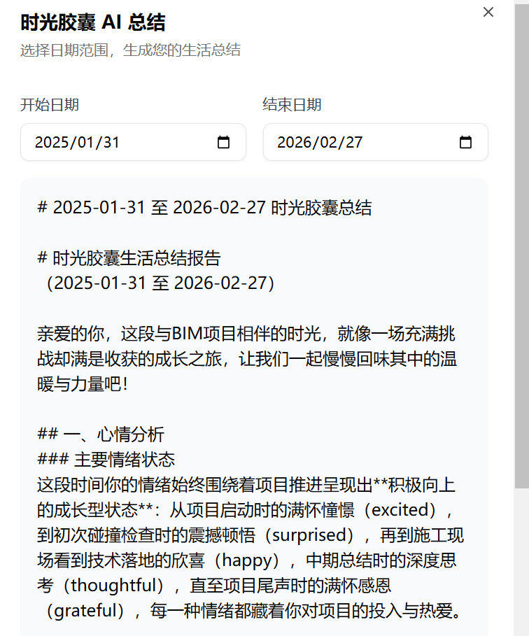 写总结的时候,我本来以为要翻半年的聊天记录、计划表,结果打开时光本,点了一下 “AI 生成总结”, 选择时间段,系统自动把 BIM 项目的完成情况、时光胶囊里的瞬间、我记录的健身和读书的事项都整理成了一篇完整的总结: