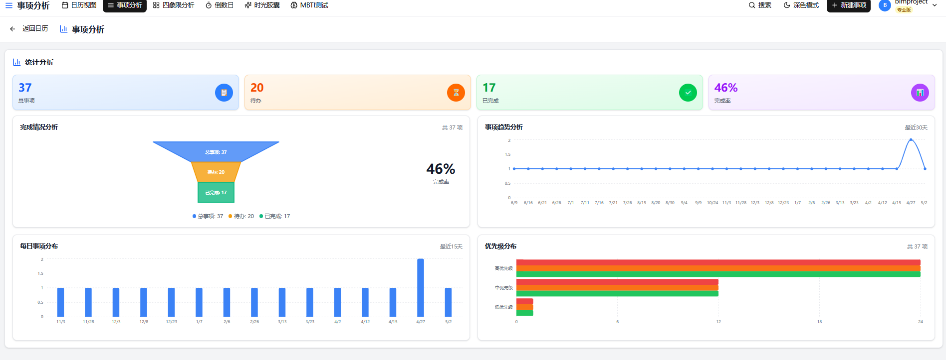 - 项目完成率 46%,已完成 17 个任务,待办 20 个任务,高优先级任务 24 个,中优先级 11 个,低优先级 2 个;