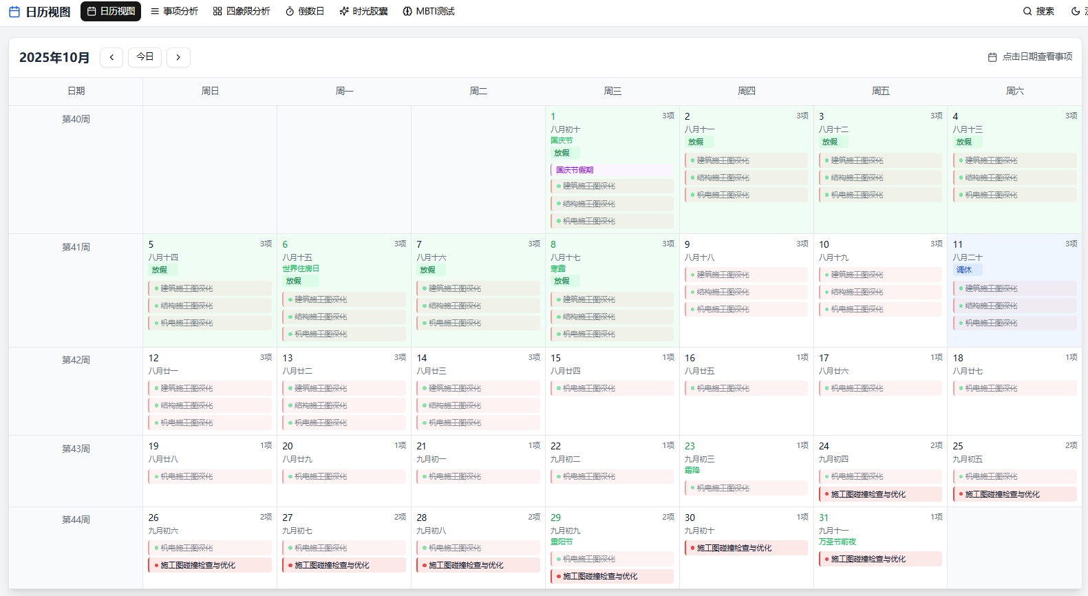 最开始接手这个跨10个月的 BIM 项目时,我是真的慌了 ——7 个阶段、37 个任务,高优先级的就有 24 个,光是梳理框架就熬了两个晚上。直到朋友给我推荐了时光本,我发现它的矩阵日历太懂做项目的人了:横向是日期,纵向是星期,一眼就能看到这周哪天有项目评审会,哪天要去施工现场,连农历都标得清清楚楚,我再也不用对着手机日历换算老妈的农历生日了。而且我可以按住鼠标拖拽选择多个日期创建事项,比如创建 “BIM 软件采购” 的任务,直接选了 3 天,一秒就创建好了,比我之前用的项目管理软件简单 10 倍。日历还支持自动滚动,查看跨年度的项目进度特别方便,我这个从 2025 年 6 月到 2026 年 4 月的项目,打开日历就能一目了然。