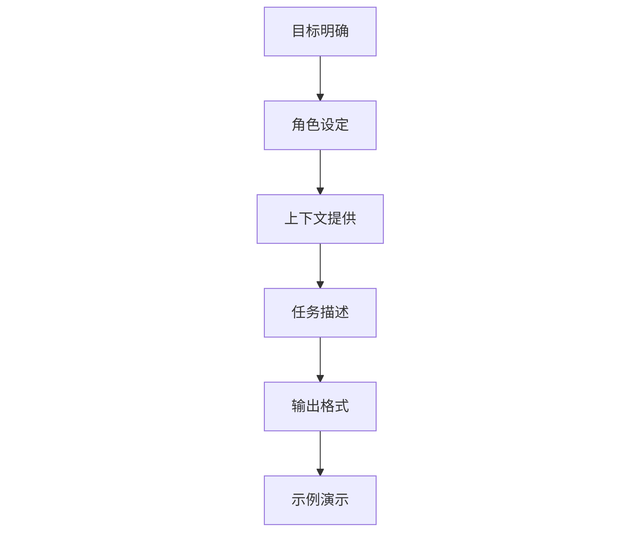 graph TD A[目标明确] --> B[角色设定] B --> C[上下文提供] C --> D[任务描述] D --> E[输出格式] E --> F[示例演示]
