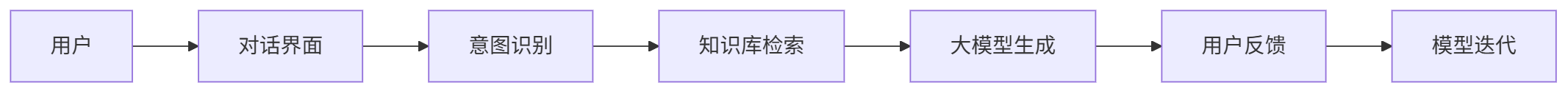 graph LR User[用户] --> Chatbot[对话界面] Chatbot --> NLU[意图识别] NLU --> KB[知识库检索] KB --> LLM[大模型生成] LLM --> Feedback[用户反馈] Feedback --> Retrain[模型迭代]