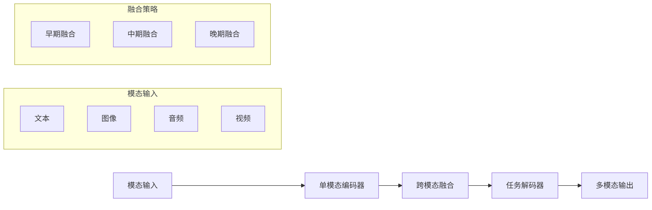 graph LR A[模态输入] --> B[单模态编码器] B --> C[跨模态融合] C --> D[任务解码器] D --> E[多模态输出] subgraph 模态输入 A1[文本] A2[图像] A3[音频] A4[视频] end subgraph 融合策略 C1[早期融合] C2[中期融合] C3[晚期融合] end