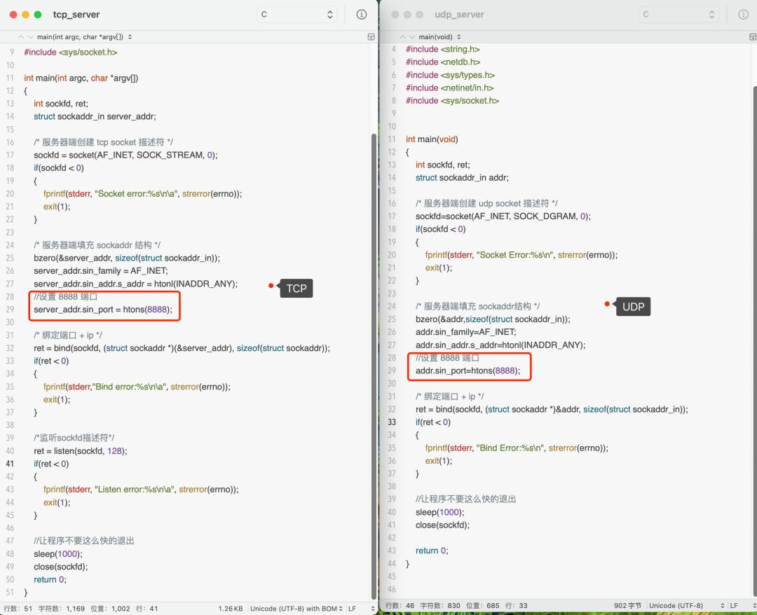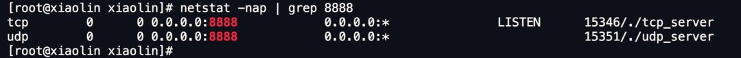 我简单写了 TCP 和 UDP 服务端的程序,它们都绑定同一个端口号 8888。