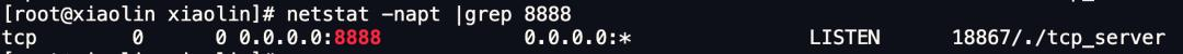 运行第一个 TCP 服务进程之后,netstat 命令可以查看,8888 端口已经被一个 TCP 服务进程绑定并监听了,如下图: