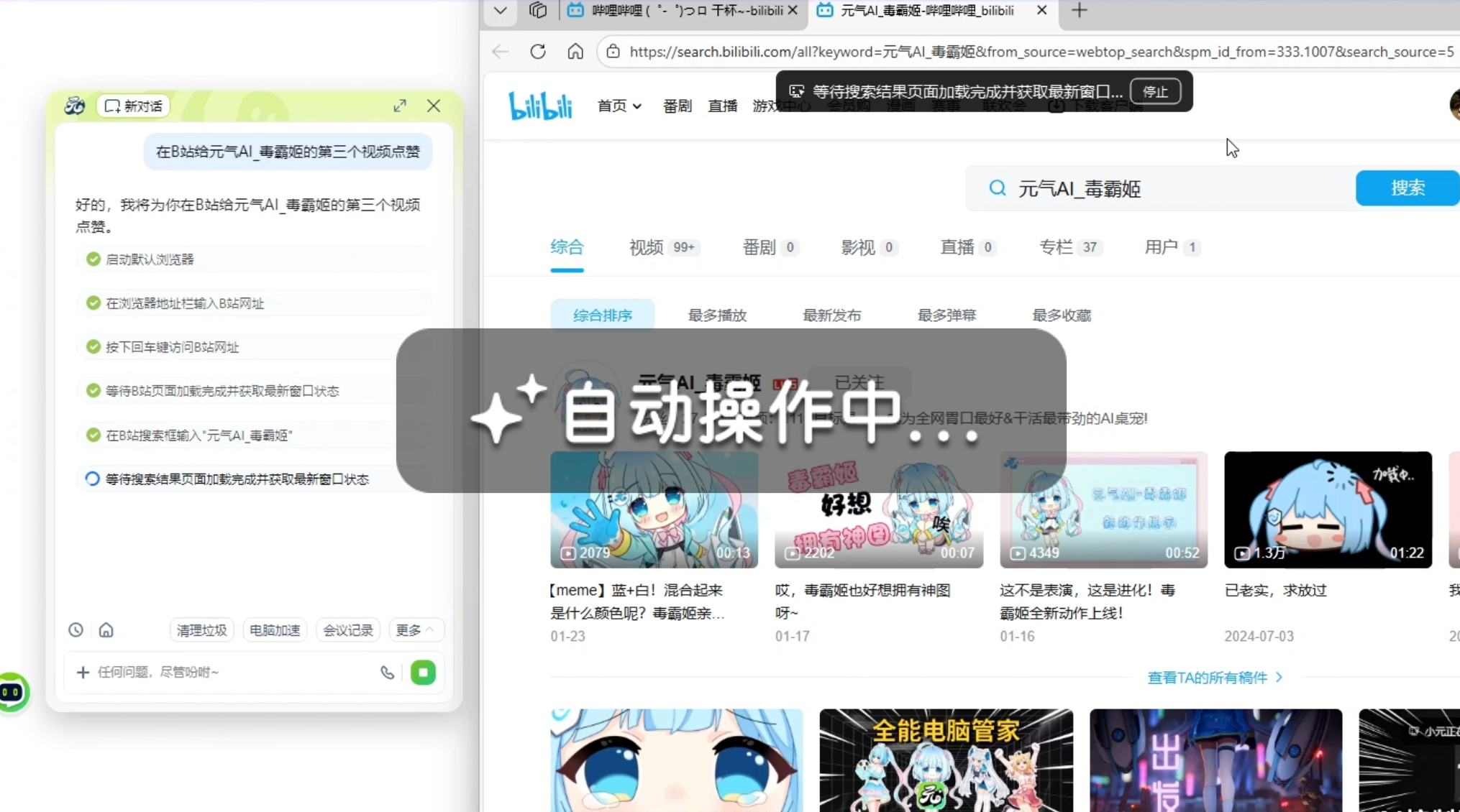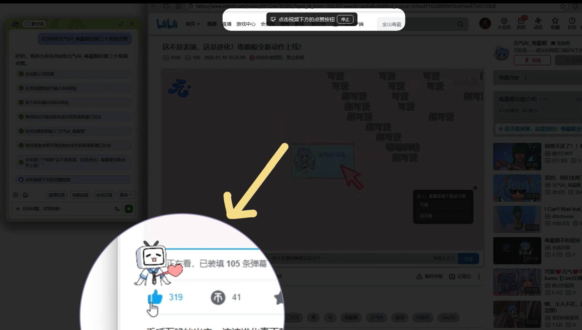 "在B站给元气AI_毒霸姬的第三个视频点赞"