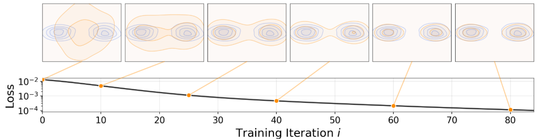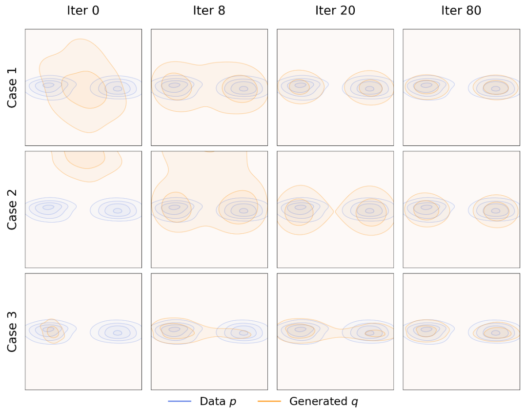 上图展示了一个二维玩具示例:在三种不同初始化条件下,生成分布 q 在训练过程中逐步演化,并最终逼近一个双峰分布 p。在这一玩具实验中,本文的方法能够在不出现模式坍塌的情况下逼近目标分布。即使在 q 被初始化为坍塌到单一模态的状态(图中下方所示)时,这一性质仍然成立。