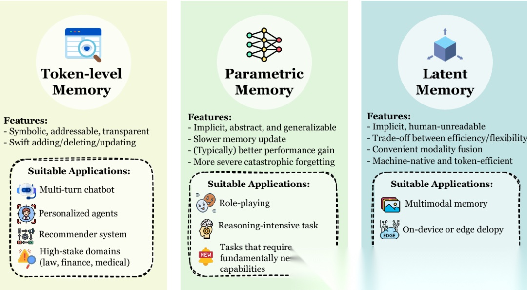 记忆在形式层面:出现三种主流实现:词元级(token-level)记忆、参数记忆(parametric memory)和潜在记忆(latent memory);