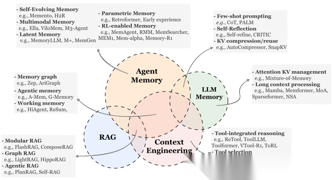 目前,社区对智能体记忆的理解仍然存在分歧。在实践中,研究人员和从业者常常将智能体记忆与相关概念如大语言模型记忆、检索增强生成(RAG)和上下文工程混淆。虽然这些概念在信息如何在大语言模型驱动系统中管理和利用方面本质上是相互关联的,但它们在范围、时间特性和功能角色上有所不同。