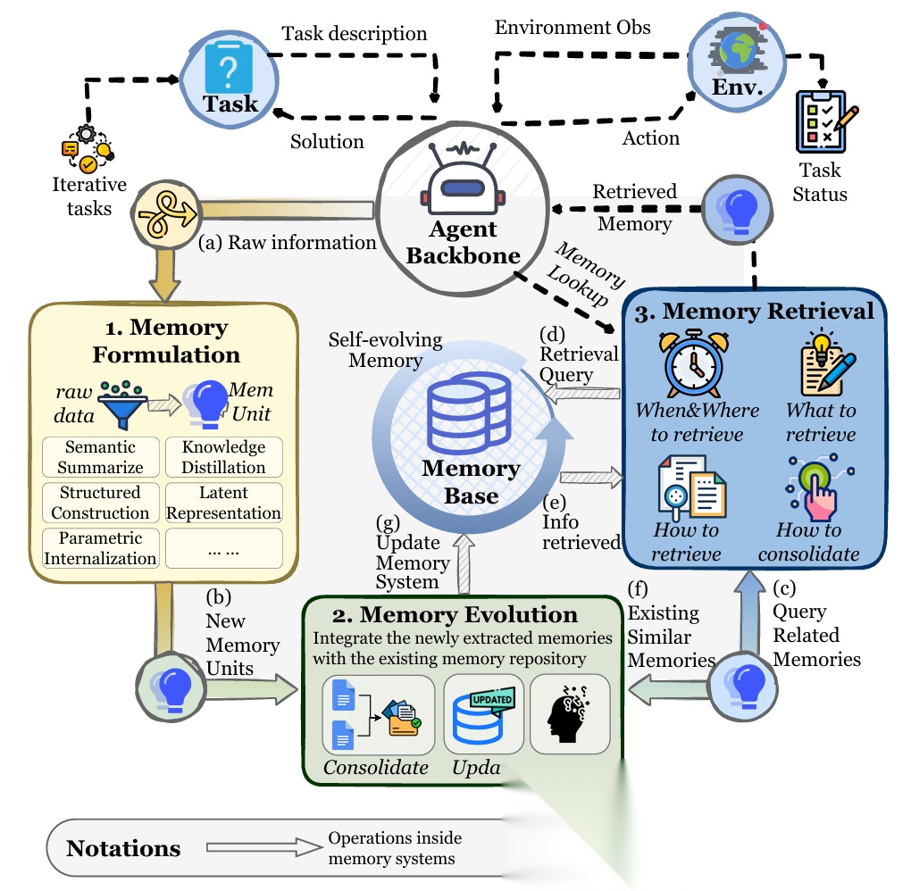 这三个过程并不是独立的,它们形成了一个相互连接的循环,推动着记忆系统的动态演化和运作。在记忆形成阶段提取的记忆会在记忆演化阶段与现有的记忆库进行整合和更新。利用通过前两个阶段构建的记忆库,记忆检索阶段能够实现有针对性的访问以优化推理。反过来,推理结果和环境反馈会反馈到记忆形成阶段以提取新的见解,并反馈到记忆演化阶段以完善记忆库。总体而言,这些组件使得大型语言模型能够从静态条件生成器转变为能够持续从变化的环境中学习并作出响应的动态系统。