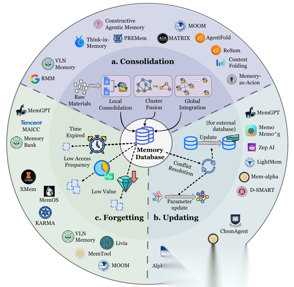- 记忆形成:此过程专注于将原始经验转化为信息密集的知识。记忆系统不是被动记录所有交互历史,而是选择性地识别具有长期效用的信息,如成功的推理模式或环境约束。这部分回答了“如何提取记忆?”的问题。