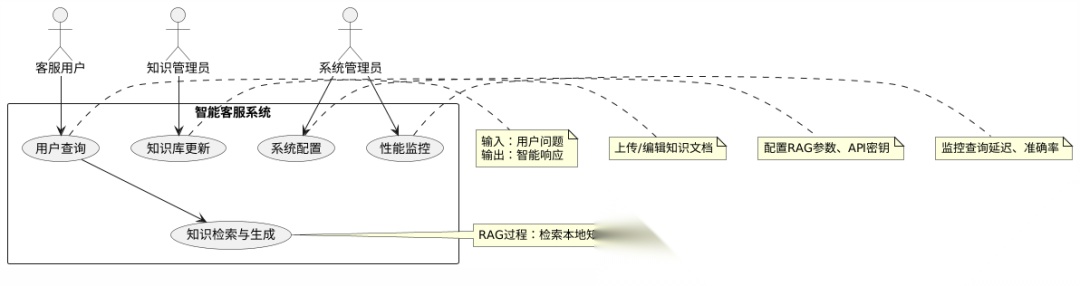 业务架构图展示业务角色、用例和系统交互,包括客服用户、管理员的查询、知识检索和管理系统管理等。项目聚焦于使用RAG(Retrieval-Augmented Generation)技术,从本地知识库检索信息生成智能响应。