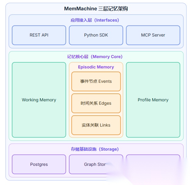 传统的 RAG (Retrieval-Augmented Generation) 方案通常是将对话历史切片后扔进向量数据库。这种做法虽然解决了 “召回” 问题,但丢失了 “结构” 与 “时间”。MemMachine 的核心创新在于它构建了一个三层记忆仿生模型,尤其是引入了图数据库来处理情景记忆。