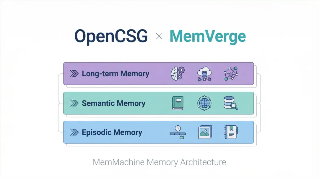 OpenCSG与MemVerge达成战略合作,在CSGHub中引入Agent Memory Service,为AI Agent提供长期记忆能力。传统Agent因缺乏记忆功能难以实现规模化部署,此次合作通过标准化的分层架构设计,使Agent能够跨会话继承上下文、积累经验并共享信息。MemVerge的MemMachine作为首个Memory Backend接入系统,采用可插拔架构支持企业灵活选择。该方