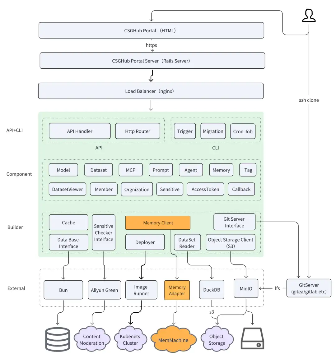 从上图可以看到,CSGHub 采用了分层架构设计:在 Builder 层中包含了 Memory Client 组件,通过 Memory Adapter 与外部的 MemMachine 服务进行交互。这种设计使得 Memory Service 能够作为可插拔的基础设施组件,与 CSGHub 的其他核心能力(如模型管理、数据集处理、Agent 编排等)无缝协同工作。