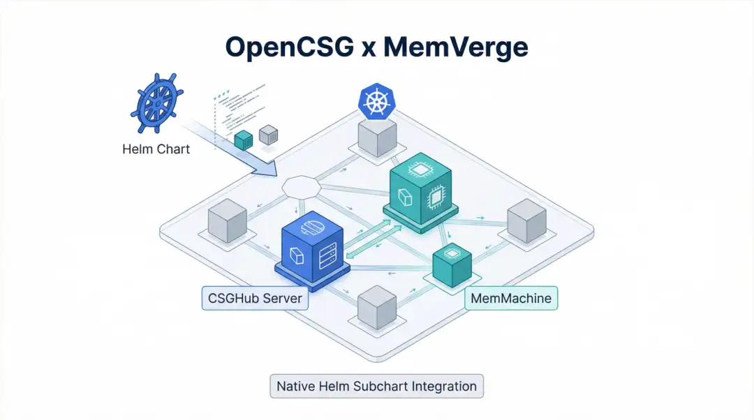 Agent Memory Service 并非“外接组件”或“第三方插件”,而是作为 CSGHub 原生能力深度集成。通过 Helm subchart 方式将 MemMachine 纳入 CSGHub 的部署体系,Memory Service 与 CSGHub Server 在同一 Kubernetes 集群中协同部署。
