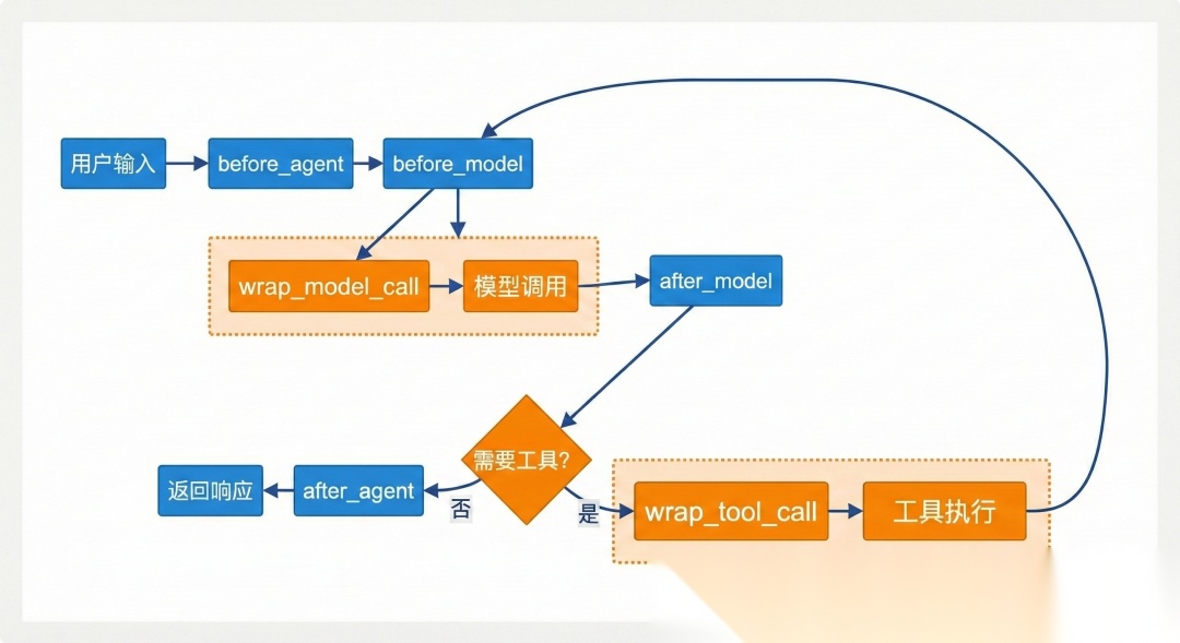 LangChain 1.x的 Middleware 机制允许开发者在 Agent 执行的各个阶段注入自定义逻辑,而无需修改 Agent 本身的代码: