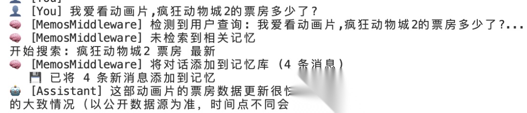 可以发现:此时Agent会检索到相关的记忆,且会智能判断是否可以利用这些记忆,这里没有再次调用搜索工具 — 这是对之前工具结果产生记忆的效果。