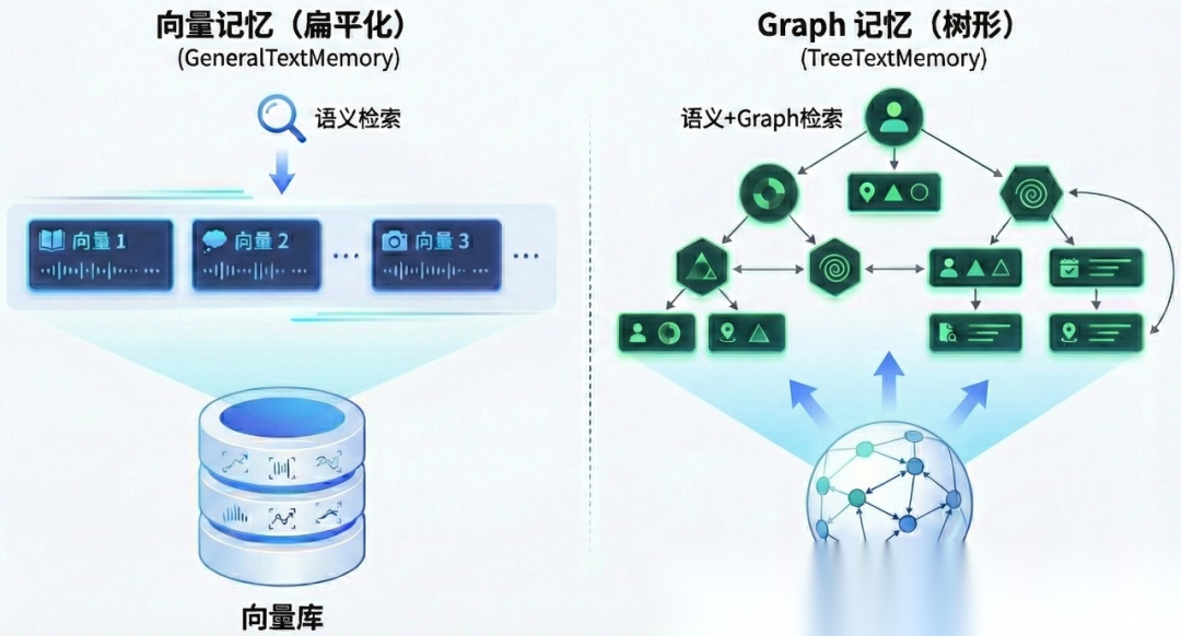 明文记忆是 MemOS 的“记忆立方体”(MemCube)中最核心的记忆形态。在物理组织上,它支持两种方式:基于向量的“扁平化”记忆,以及基于 Graph 的“树形”记忆(TreeTextMemory)。