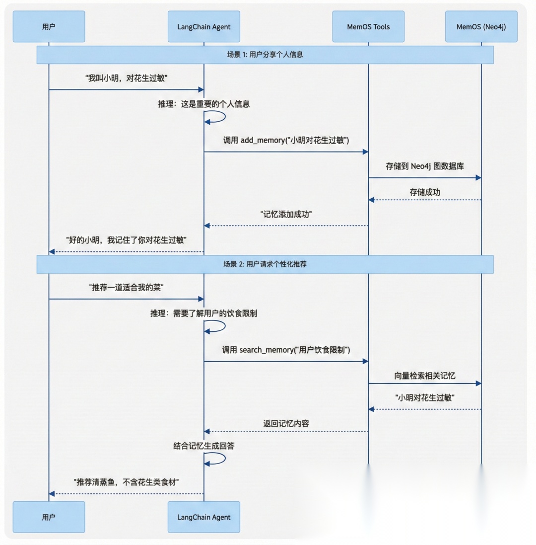 ...# 检索记忆memories = [f"- {m.memory}"for m in results["text_mem"][0]["memories"]]# 构建 System Promptsystem_prompt = f"""你是一个拥有长期记忆的助手。....以下是关于用户的记忆信息:<memories>{chr(10).join(memories)}</memories>.....其他记忆使用说明......请结合记忆信息为用户提供个性化回答。"""# 使用上面的system_prompt 调用 LangChain.....