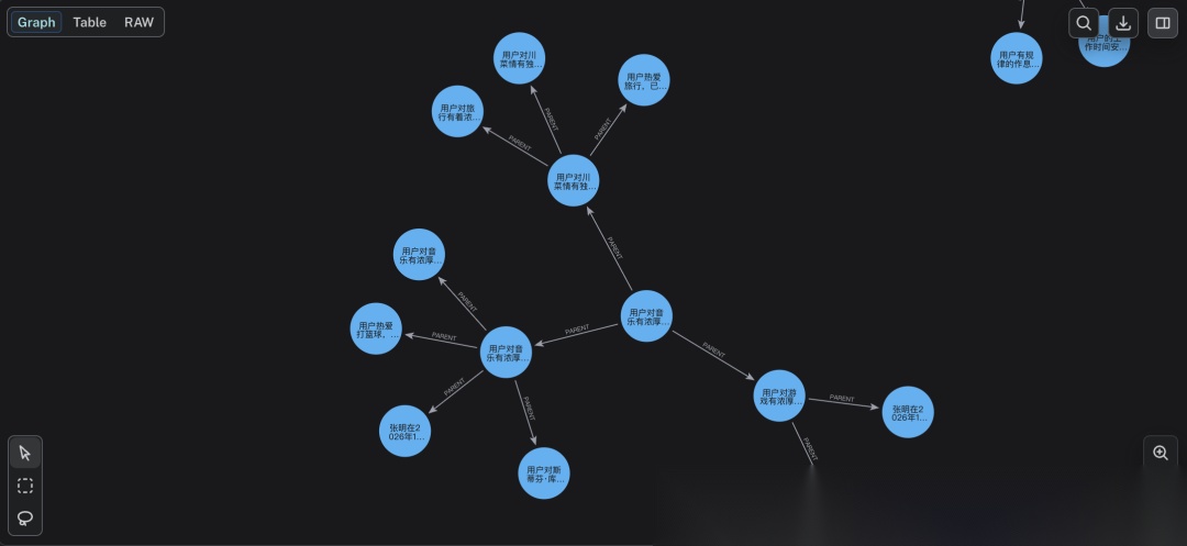 重组器在分析记忆节点后,会自动创建多种“边”关系。最常见的是 PARENT(父子关系):它会将一组语义靠近的记忆节点聚类,再生成一个摘要节点作为“父节点”,用 PARENT 关系链接到子记忆条目。比如“用户偏好”的父节点下面,可能有“运动偏好”“饮食偏好”等多个子节点。