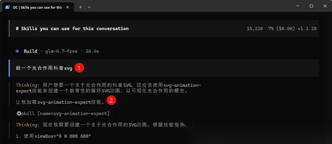 💡 效果:只要你说“帮我画一个光合作用的动画”,AI 就会给你一段代码。你保存为.svg拖进浏览器,就能看到对应的动画!