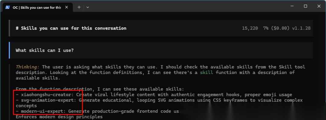 在 OpenCode/Cursor 中,只要文件存在,你在对话框输入技能名或直接提问,AI 就会自动加载。