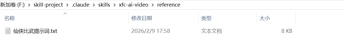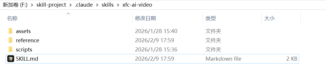 基于目录设计,在.claude目录下新建项目文件夹,如下图所示,我在F:\skill-project\.claude\skills\目录下新建了xfc-ai-video目录。