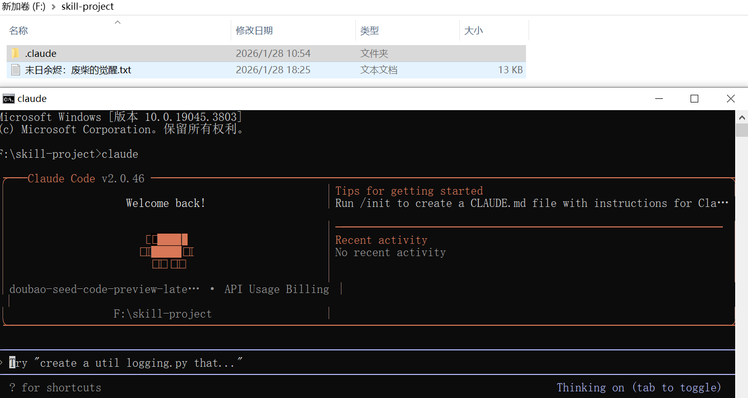 到这一步skill就制作完成了,接下来进入测试环节,回到.claude上级目录,在文件路径处输入cmd打开命令提示符,输入claude进入claude code。