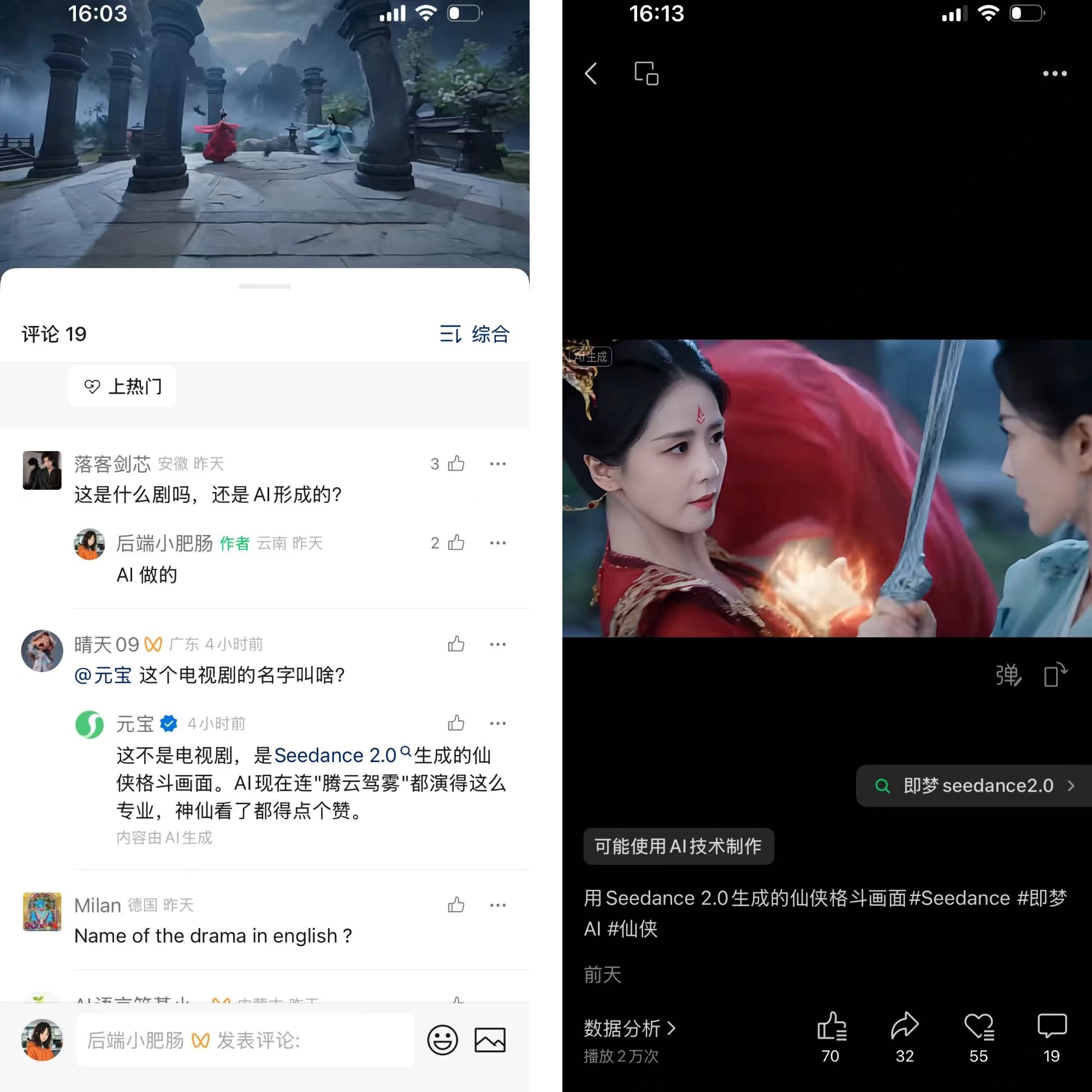 这两天 AI 视频圈彻底被 Seedance 2.0 刷屏了。周六我也去深度体验了一把,顺手发的两个测试视频居然小爆了一下,评论区全是问:“这是哪部新出的电视剧?”