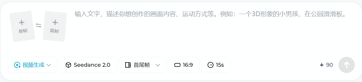 在底部会话框中选择视频生成,模型选择"Seedance2.0",模式选择"首尾帧",屏幕比例自行选择,视频时长选择"15s"。