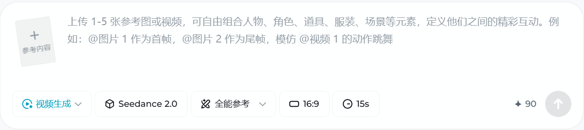 在底部会话框中选择视频生成,模型选择"Seedance2",模式选择"全能参考",屏幕比例自行选择,视频时长选择"15s"。