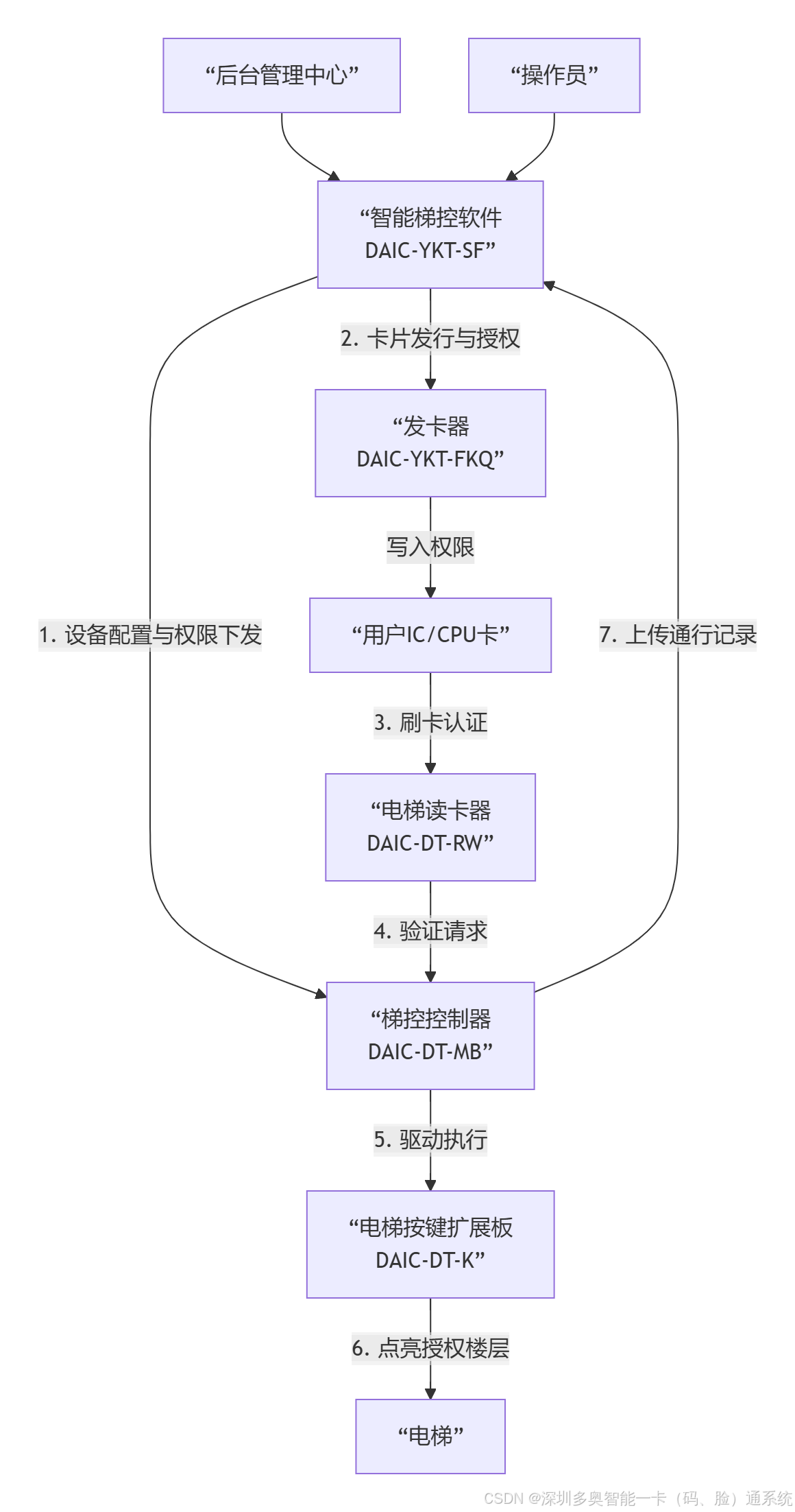 E -- 3. 刷卡认证 --> F[“电梯读卡器<br>DAIC-DT-RW”]