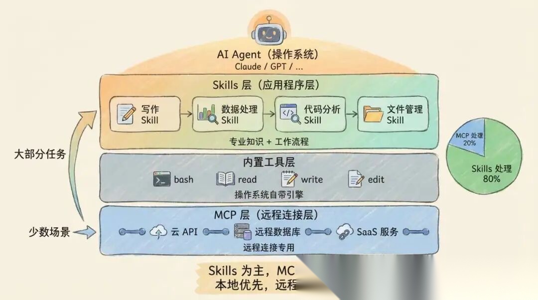 - 两者在必要时协作,但 Skills 会承担绝大部分 “教 AI 怎么做事” 的工作(这其中也包含教 AI 怎么用 McpServer、怎么用其他 Skills、怎么更好的调用核心能力)
