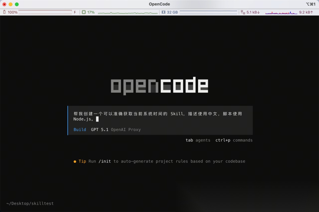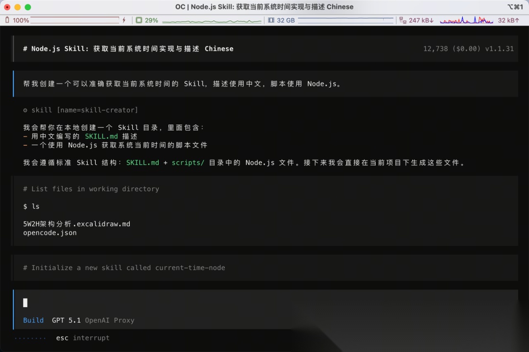 接下来,我们询问 opencode:“获取当前系统时间”,然后它就会自动找到刚刚生成的 Skill 并调用里面的脚本: