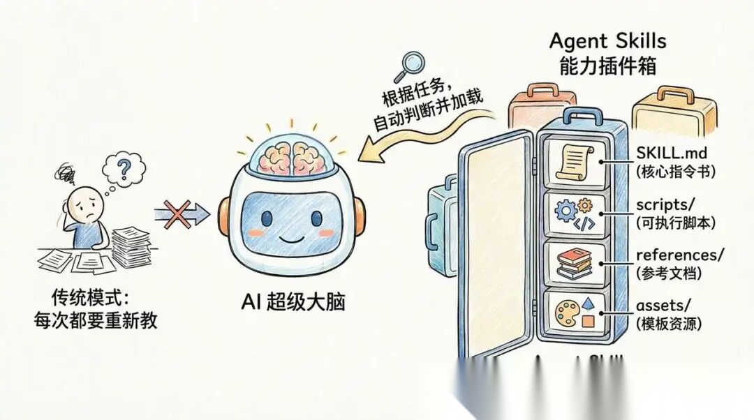 你可以把 Claude(支持 Skills 的客户端)想象成一个超级大脑,而 Agent Skills 就是给这个大脑安装的外接工具箱。