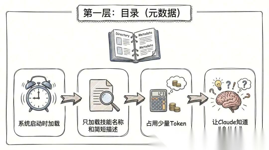 - 有什么用? 这一层占用的资源极少,可能就几百个 Token。它的作用就是告诉 Claude:“嘿,你的工具箱里有‘查周报’、‘处理 Excel’ 这几个工具哦。”