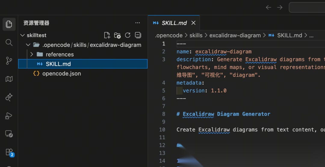 接下来,按照刚才的流程,我们把这个 Skill 下载下来,放到 .opencode/skills 目录下: