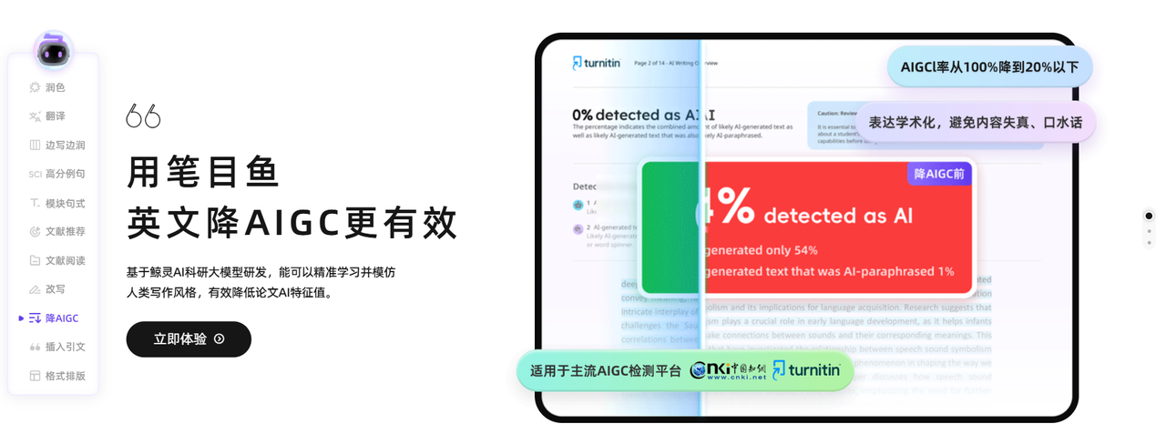 学长实测:写英文论文或者留学的同学看这个,国内很多中文降ai率工具改英文就是灾难,全是中式英语。笔目鱼是专门针对英文的,基于鲸灵AI科研大模型 ,它最强的地方是能跟Turnitin/iThenticate这些国际平台对接,实现结果的交叉验证,这点很稳。