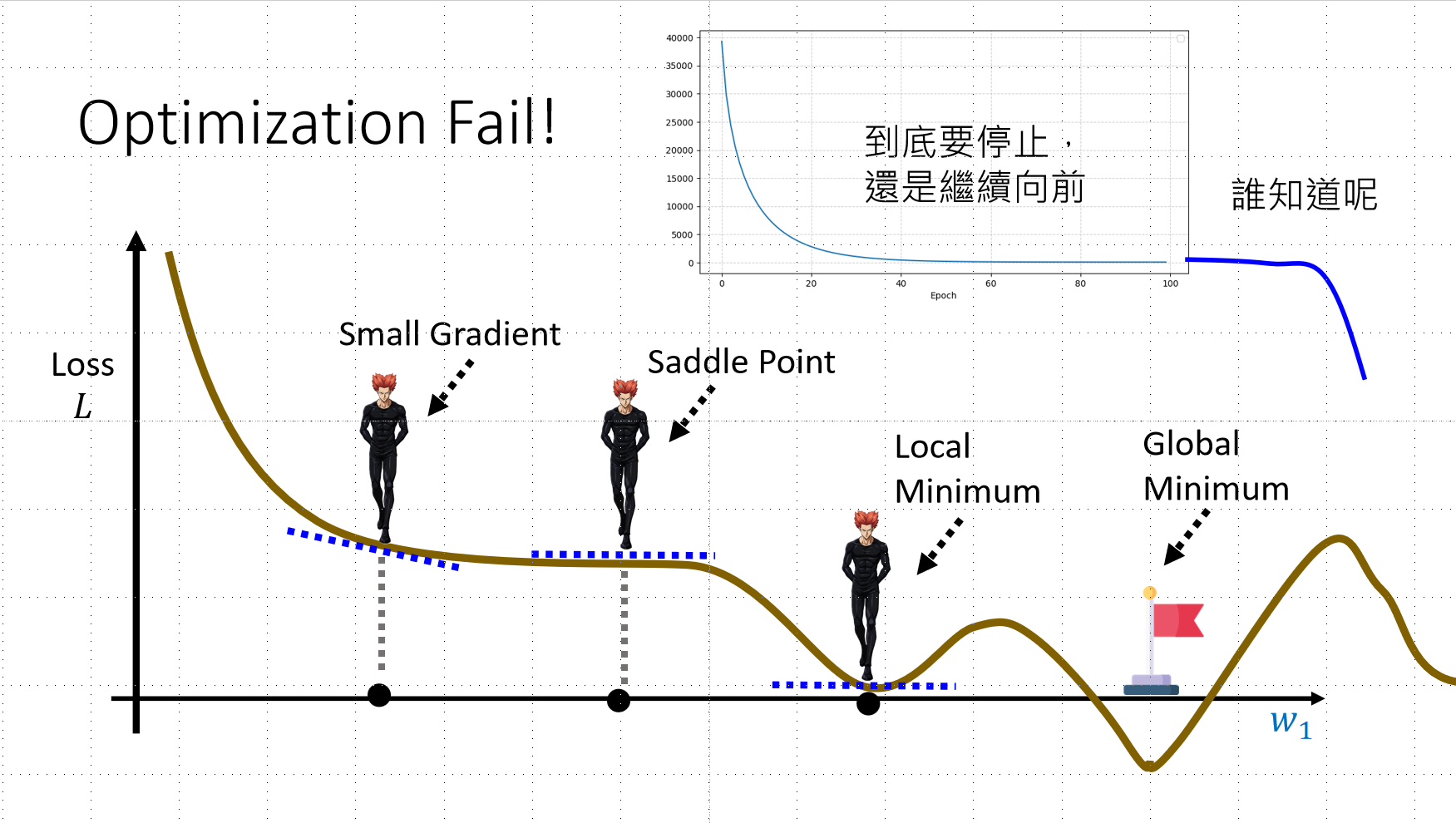 后续如果Loss依旧不满意,有可能是步骤三的问题,我们可能训练的时候,没有训练到更好的函数,而是卡在了某些平衡点(山谷),也有可能是卡到了Saddle Point,此处的微分是0,但是实际上函数可能是左边是向下的,这个点是平的,后续的一部分函数也是平的,这时候模型会以为已经到达了平衡点,我们一旦往右边多跨一点,就有可能让loss更低。